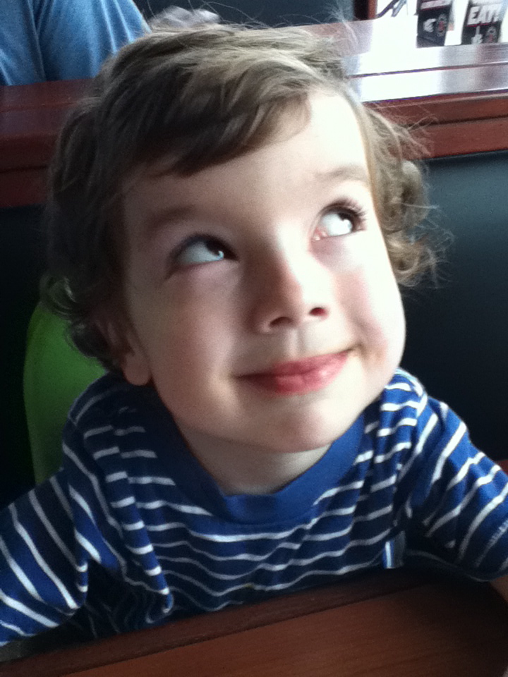 We left Thursday night after dinner and arrived at a motel in the middle of Pennsylvania at 11:15 p.m. Oscar had slept soundly in the car for about two hours, but when we arrived at the motel, he woke right up, full of energy, delighted to be on a trip and at the motel. He sat in bed, bouncing and grinning, repeating, “I like this trip! I like being at the motel!” All three of us did finally go to sleep around midnight. We drove the rest of the way to Baltimore on Friday, landing at aunt Linda’s for the weekend.