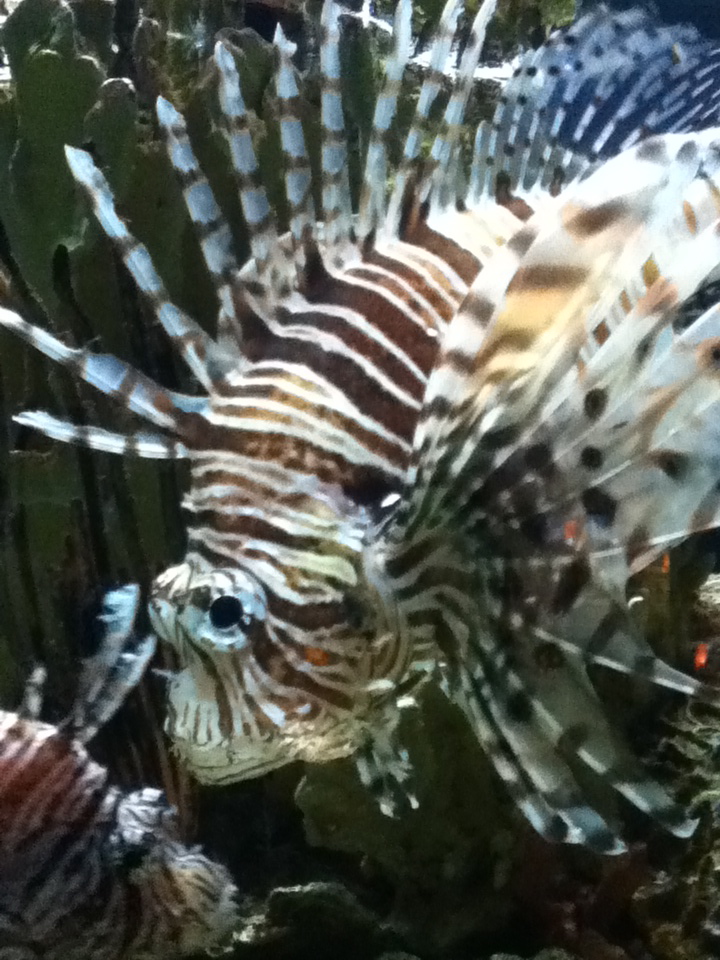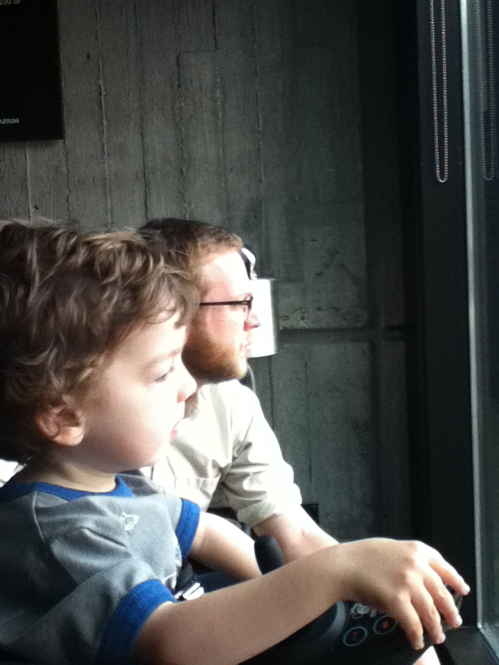 Saturday morning we got up early and headed to the aquarium. It was just as magical as we expected it to be, and then some. Oscar was free to decide which fish and which tanks he wanted to get close to, and then go check them out. Several docents (if that’s what you call them in an aquarium) took a liking to Oscar (which seems to happen nearly anywhere we go) and stuck with us for long stretches to give us added information (did you know that an octopus has NINE brains?! One primary one, plus one for each tentacle). Aunt Linda had also done a little research ahead of time to find out when the divers would be in the water that day. Oscar had several diver sightings, including a conversation through the glass of the tank in which one diver named Dennis took a liking to Oscar and they each showed their mutual interest in each other by sticking their tongues out at each other!