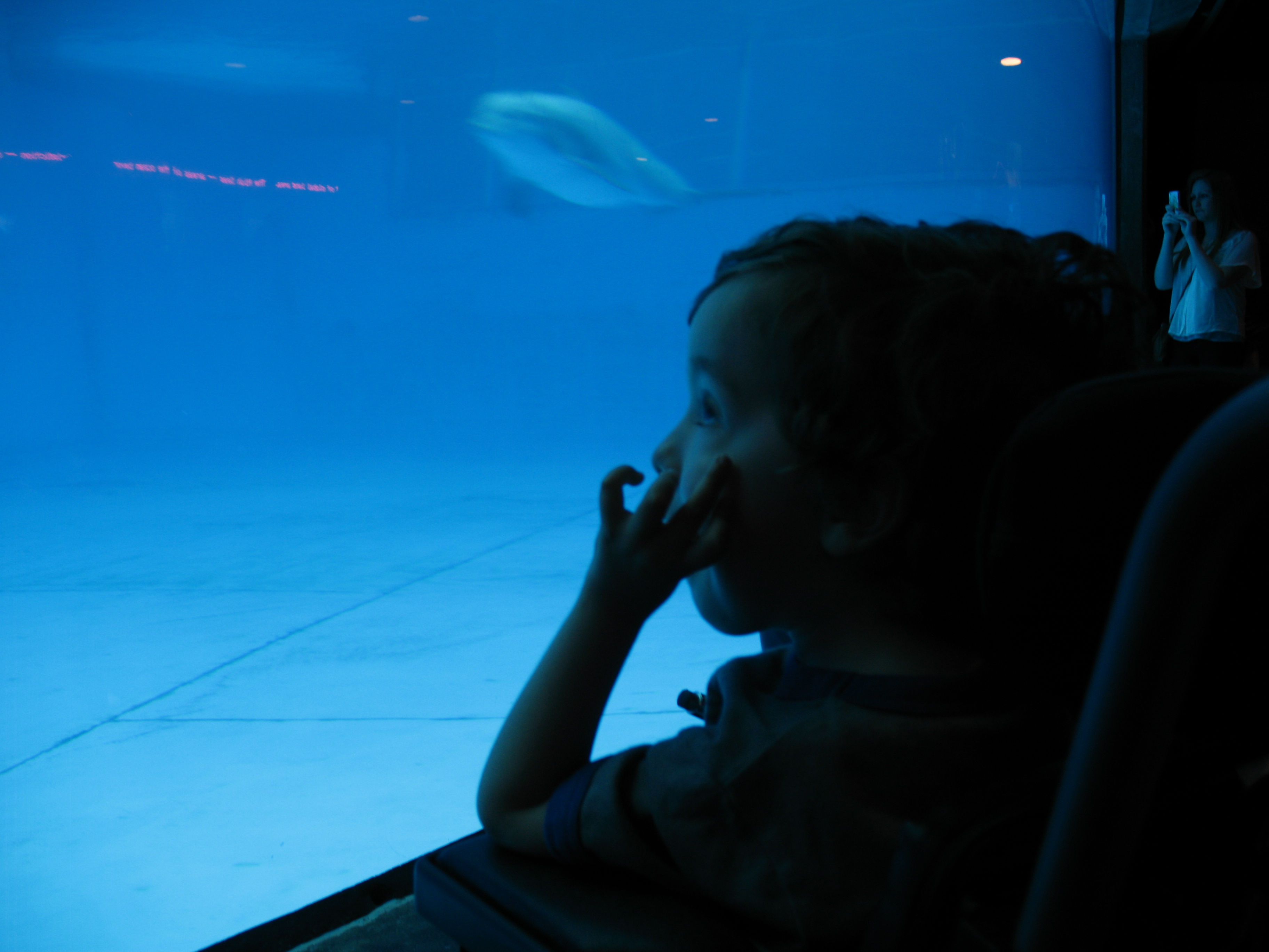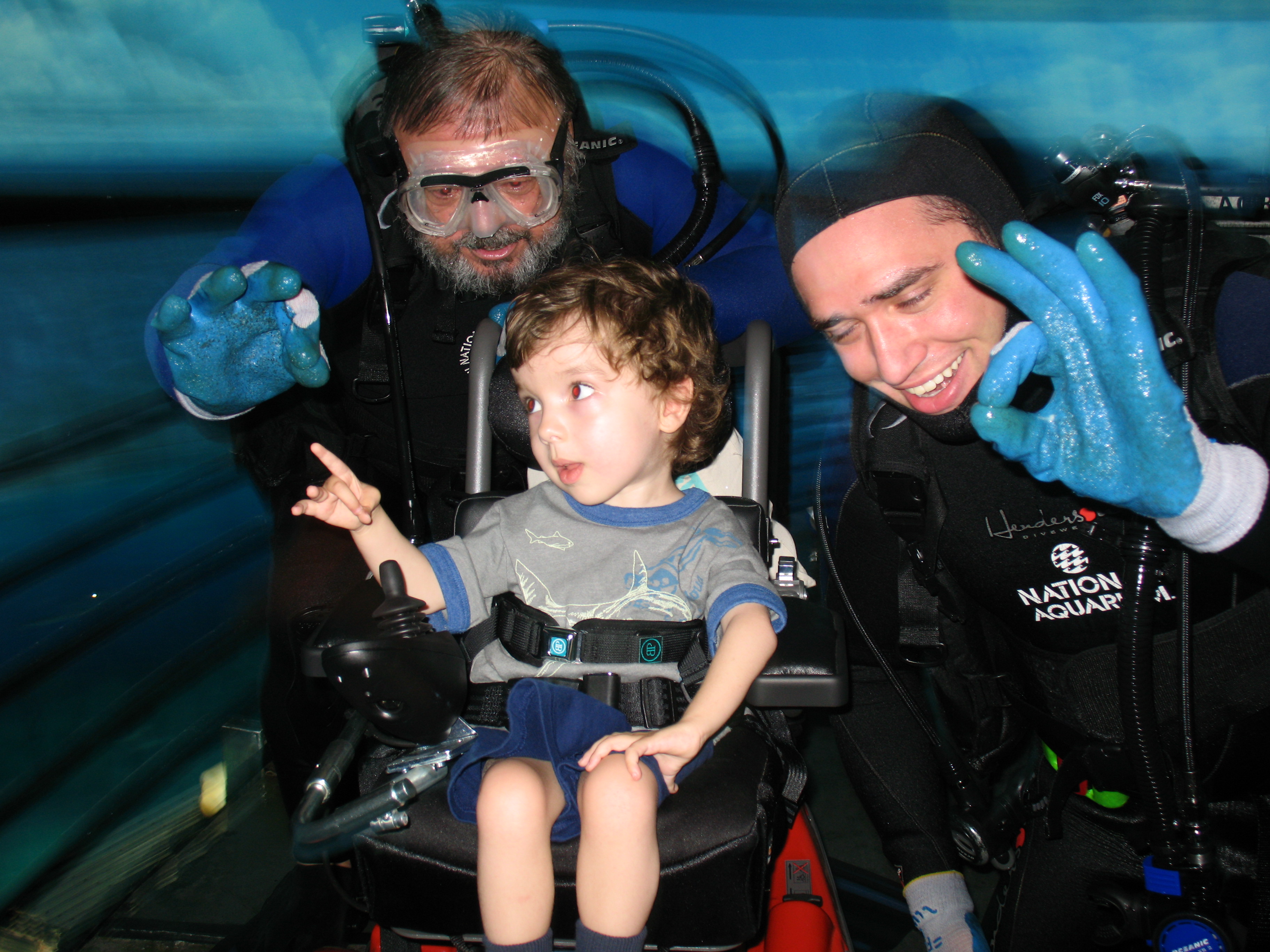 Oscar was quite enamored that this diver took his mouthpiece out in order to return Oscar’s tongue gesture! Dennis then motioned that Oscar head up the ramp to the top of the tank. Dennis and another diver, Zach, met us there where Oscar had his picture taken with them. This was the highlight of the visit for Oscar. He especially likes this photo where all three of them are making the special diver “OK” hand signal. Later, in the dolphin viewing area, a woman, probably in her eighties, was being pushed in a wheelchair. As Oscar zoomed out of the area, he stopped right next to her and looked her in the eye and said, “I use a go chair too.” It was so endearing. We’ve pointed out other wheelchair users to him before, but this was his first opportunity to physically stop and choose to interact. So sweet. A miraculous day!