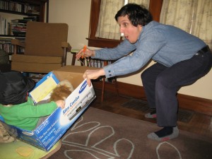 One day, when Oscar was about sixteen months old, he really wanted to go sledding, but it was too cold to go out. My answer would have been, “We’ll go sledding another day. We’ll have to do something else today.” But not David. He fashioned a sled out of a cardboard box and some rope and he set up a small hill in our living room with pillows and took Oscar