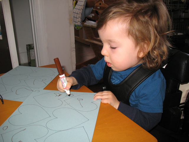Oscar continues to do well. He recently had his routine 6-month follow up with both the neurologist & pulmonologist: he is in good health. He continues to work hard in PT and OT. And he continues to be a stubborn two-year-old who often attempts to talk his way out of the activities he doesn’t want to do! He recently acquired his own mobile stander, which allows him to propel himself while in a standing position. Soon he’ll also have his own gait trainer, which will allow his body to go through the mechanics of walking while being fully supported. Two other new acquisitions for Oscar are a potty chair and “big boy” bed (a mattress on the floor, for now). He has made good use of both so far and we will continue working toward full-time use of each!