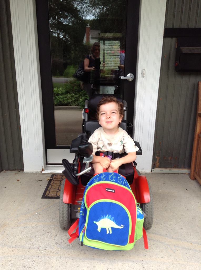 There was a lot of preparation leading up to the first day. We had eleven visits/meetings at the school, that I can recall, between January and August. Some of these are visits that any child entering kindergarten would make: 1. Parent informational meeting, 2. Registration (dropping off paperwork), 3. Kindergarten screening day, 4. Meet the teacher and visit the classroom. The other seven were more specific to a child falling into the realm of special education with an IEP (Individualized Education Plan), or just more specific to Oscar himself: 1. An initial meeting with the school psychologist, who is also the chair of the Committee on Preschool Special Education and helps many families with transition (this was to start talking about classroom layout, toiletting needs, busing needs, etc), 2. A meeting with the school psychologist, Oscar’s new PT and new OT to start to lay a plan for his services, 3. A tour of the building with Oscar to get him familiar and to assess the accessibility of the facilities, 4. The CSE (Committee on Special Education) meeting to go over his IEP and address any needs for the coming year, 5. A visit to the playground with the PT to assess the accessibility of the playground and allow Oscar to become more familiar with his new PT, 6. A visit to demo a new stander for school, and 7. A team meeting (his teacher, his one-on-one, his OT, his PT, and us) the week before school started to go over final details before school started.