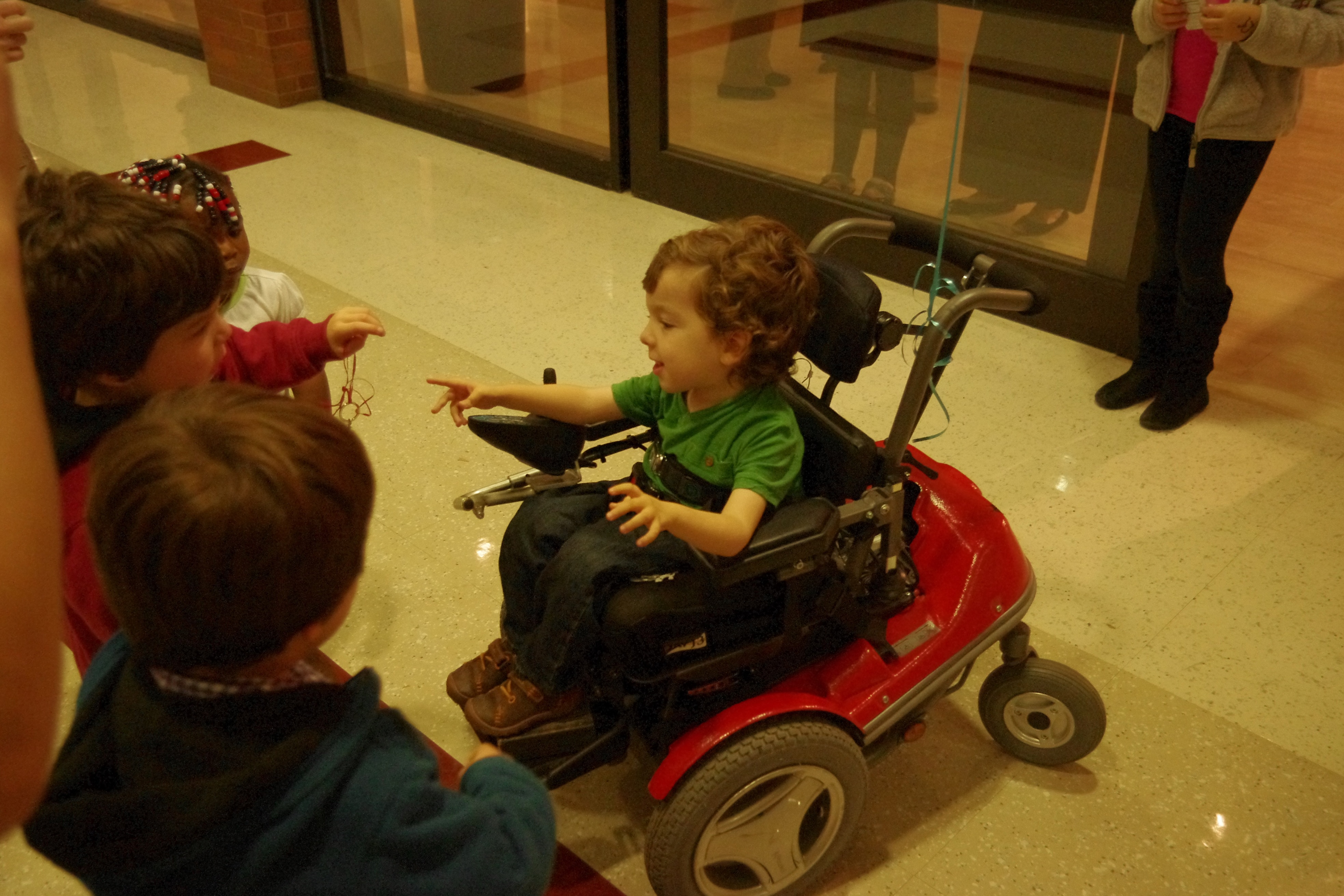 Oscar had an incredible time at his "van party" playing in the Kids' Zone and zooming the long hallway at NTID with his friends (we were able to bring his power chair thanks to a surprise loan/rental of an accessible van). What a thrill it was for us to watch Oscar playing independently. There were several times during the evening that we asked one another, "Where's Oscar?" and the response was, "I don't know." This made our hearts sing because this was the first time Oscar has been able to really just be a kid with other kids, "running," hiding, disappearing, without some adult assistance. Just the way a typical 4-year old plays. Oscar's unbridled joy was the ultimate success and we look forward to similar experiences once we get a van of our own!