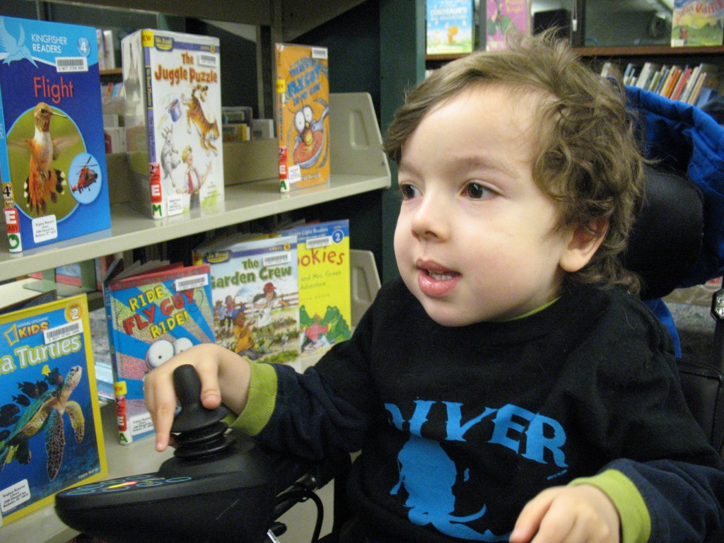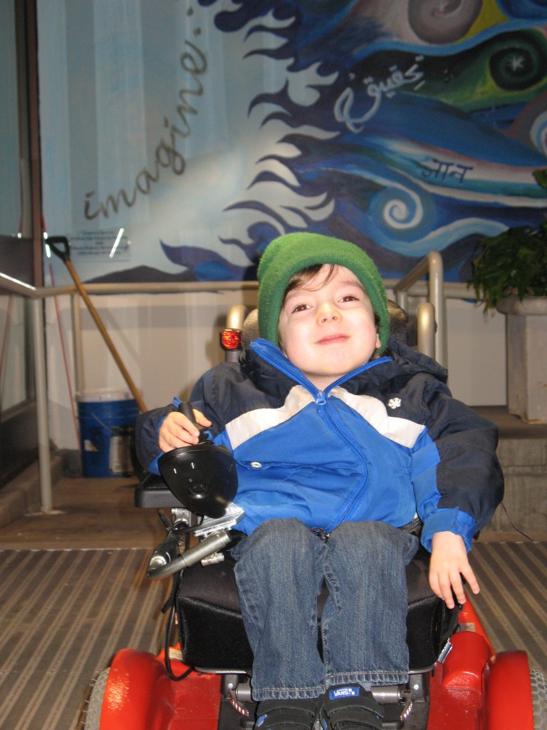 [caption id="attachment_850" align="aligncenter" width="1024" caption="Oscar arriving at preschool for the first time in his power chair!"]