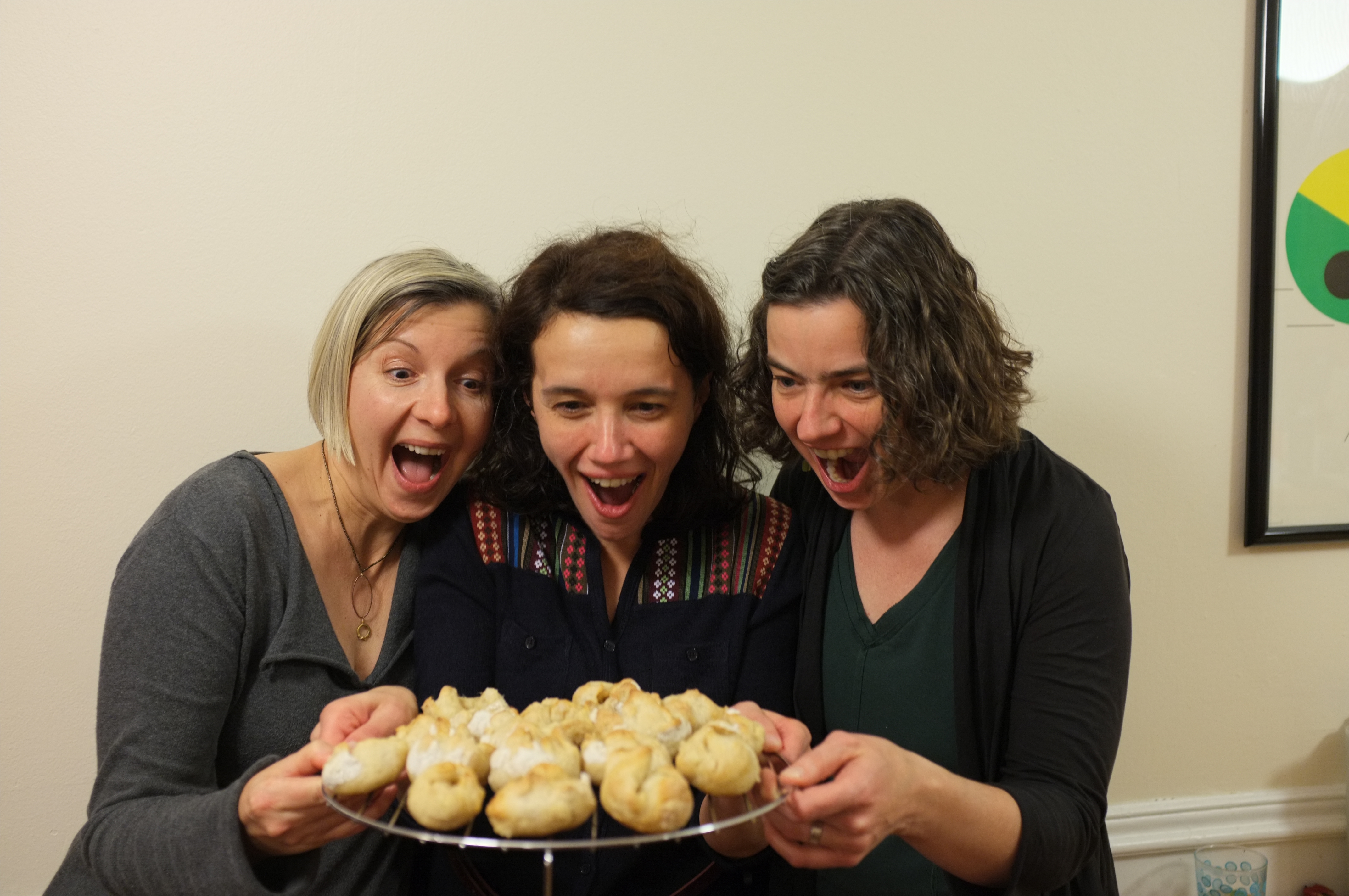 [caption id="attachment_1161" align="alignnone" width="300" caption="Sacaduros! The magic of Thanksgiving. Donna, Monica, & Sally overtaken by the magic after a long and joyful day of cooking, moments before digging in. "]