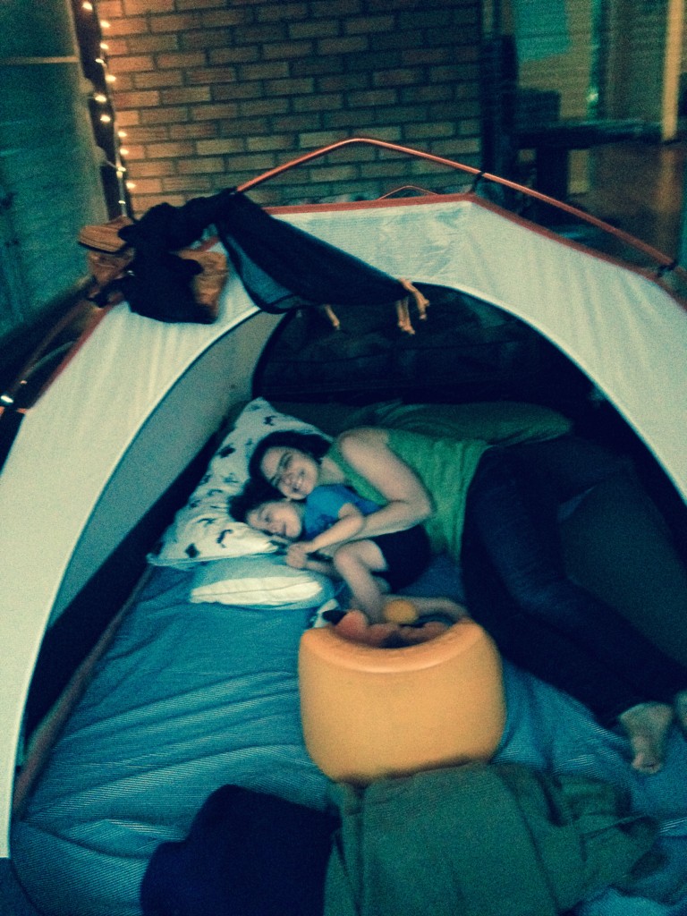 One chilly and rainy summer weekend, we set our tent up in our back porch and slept (almost) outside!
