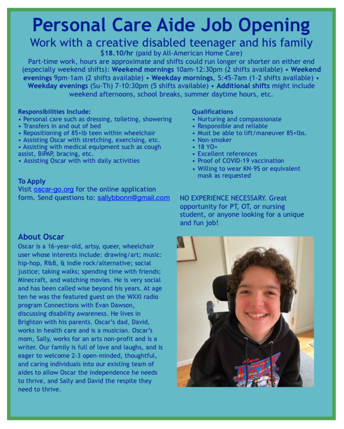 Work in our home with 16-year-old Oscar, assisting with daily care tasks such as dresssing, toileting, showering, and more. Learn about accessibility and interdependence while interacting with a highly engaging high school junior (and his parents!). See job description and qualifications below. We are looking for 2-3 thoughtful, compassionate, committed individuals to become part of our team of personal care aides.$18.10/hr (paid by All-American Home Care)