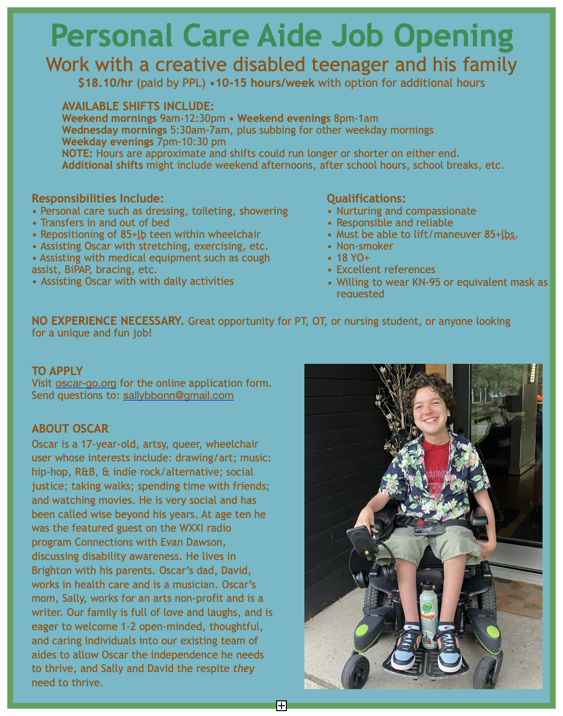 Work in our home, in Brighton, in a relaxed environment, providing care for a fun, creative high school senior, who uses a power wheelchair. We are looking for one or two people to join our team of personal care aides.